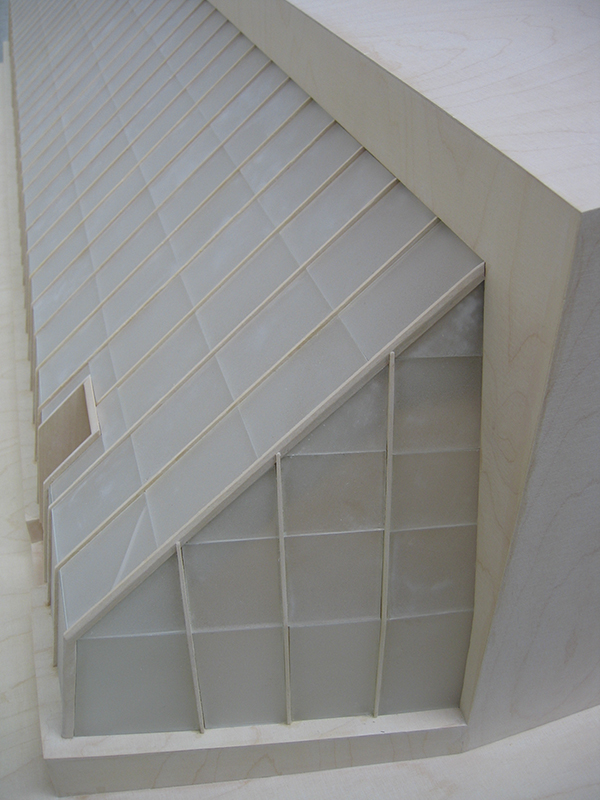 I reduced the intended volume of the school building by a ratio of 1 to 3½. An incision along the roof ridge of the central aisle formed a completely level, vertical wall surface. This volume, in the form of a greenhouse, was positioned in the southern part of the school plot.