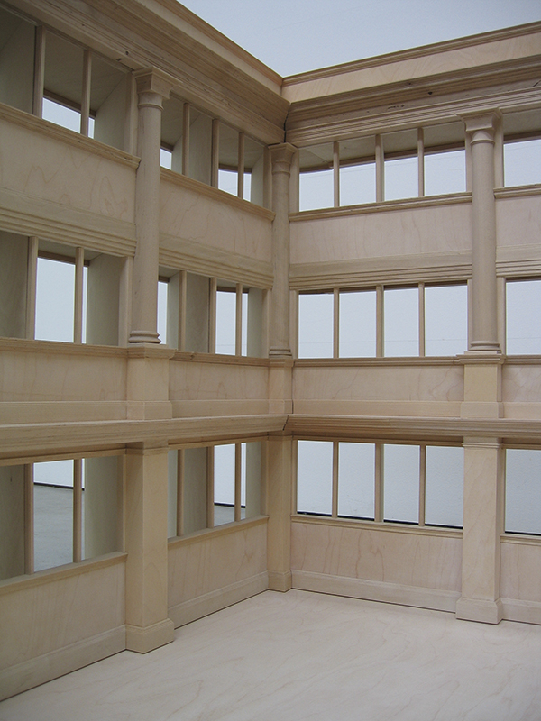 In front of the window stands a wooden model; The Gallery. It is a, built to scale – but manipulated, model of the room itself. The character of the gallery, which can be surveyed like a diorama from the street outside, relates to the room of the model. The room of the model itself takes the form of a temporary construction, a construction placed in a fictional, larger room.