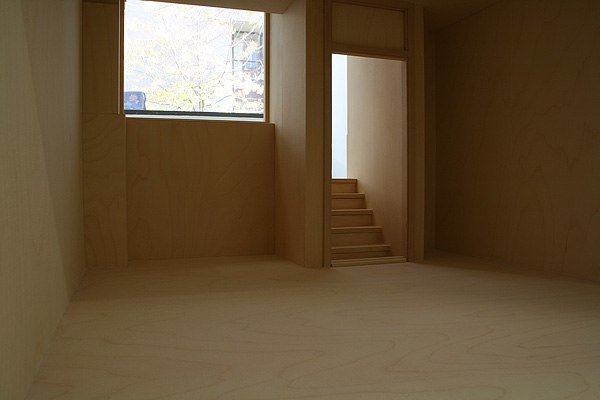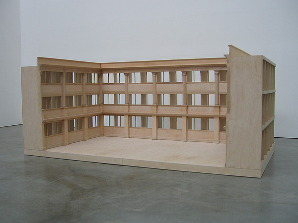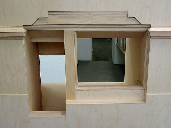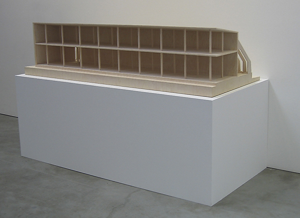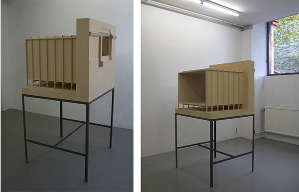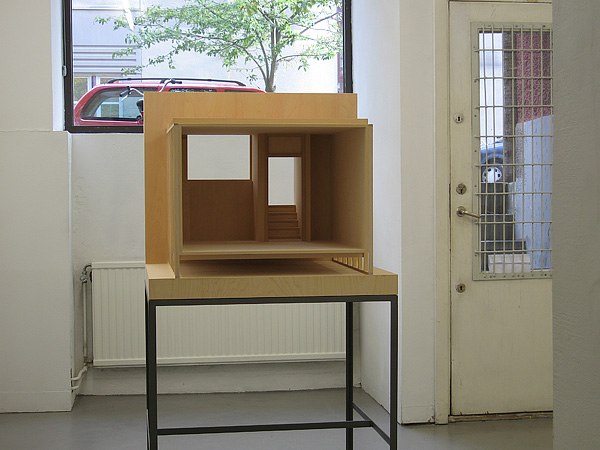 In front of the window stands a wooden model; The Gallery. It is a, built to scale – but manipulated, model of the room itself. The character of the gallery, which can be surveyed like a diorama from the street outside, relates to the room of the model. The room of the model itself takes the form of a temporary construction, a construction placed in a fictional, larger room.