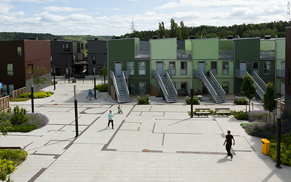 Fittjaterrassen, the Fittja Terrace, consists of apartments and row houses in a small-scale and varied urban neighbourhood. A public footpath runs diagonally through the area, reinforced by small open places (squares). The diagonal connects Fittja Centre with Fittja Äng and Fittja Gård. Through the diagonal passage Fittjaterrassen takes on a public urban small-scale character that benefits both the residents and the public as a whole.