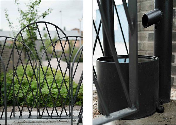 Our intention was to give the fence and entryway a clear spatial character – on a large as well as small scale – which would relate in a playful way something about the place and contribute to the idea behind The Garden of the Senses. The fence therefore became three-dimensional, suggesting a hedge, and the roof rests on narrow posts that were made to resemble tree trunks, emphasizing the various spaces and passages in and out of the garden. The entire construction also frames and reinforces the deep perspective of the narrow garden, seen from the school yard. The fence consists of 18 connected arched frames in painted wrought iron, varied in height, with diagonal bars, and two rectangular gates. The frames are placed overlapping to create visual effects which – thanks to the different directions and the regularities of the bars within the arches – acquire an organic as well as a textile character. Four groups of metal posts support a sheet metal roof with a rain gutter. The posts have different dimensions and lean slightly in different degrees and in different directions. At the top of each group of posts is an electrical fixture. Rain water from the roof drains down in one of the posts and is collected in a little pond. The gate/entryway becomes an image of nature, a space for children to play in, and an easily accessible protection from the weather.